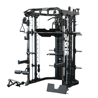Especificaciones del producto Características: Calidad comercial. Más de 300 ejercicios. Nueve máquinas en una. Tamaño compacto. Dos columnas de pesas de 100 kg con pasadores. Barra Smith con contrapeso (sin peso)