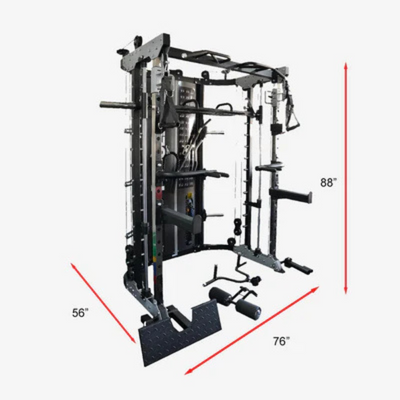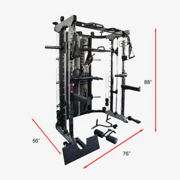 Especificaciones de la máquina Peso de la unidad: 460 kg. Capacidad de la barra Smith: 340 kg. Capacidad de dominadas: 460 kg. Relación de poleas: 1:1 = con una carga de 45 kg, la resistencia es de 45 kg. Cables: Cable de 6,2 mm recubierto de nailon, de calidad aeronáutica y con especificaciones militares, probado a 903 kg. Dimensiones: Exterior: 193 cm (ancho) x 142 cm (profundidad) x 223 cm (alto) / Interior: 112 cm (ancho) x 94 cm (profundidad) x 194 cm (alto) . Garantía del hogar: 5 años en el armazón, 2 años en las piezas, 1 año en la mano de obra y 90 días en la tapicería.