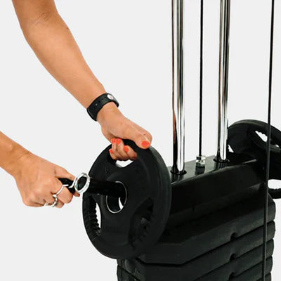 La pila de pesas con pasadores de 50 kg (110 lb) ofrece resistencia ajustable para satisfacer tus necesidades de entrenamiento con pesas. Con fácil acceso, la sencilla selección de pasadores permite ajustes suaves entre series y ejercicios. ¿Quieres más peso? ¡No hay problema! Los soportes adicionales te permiten añadir hasta 50 kg (110 lb) de peso extra usando discos.